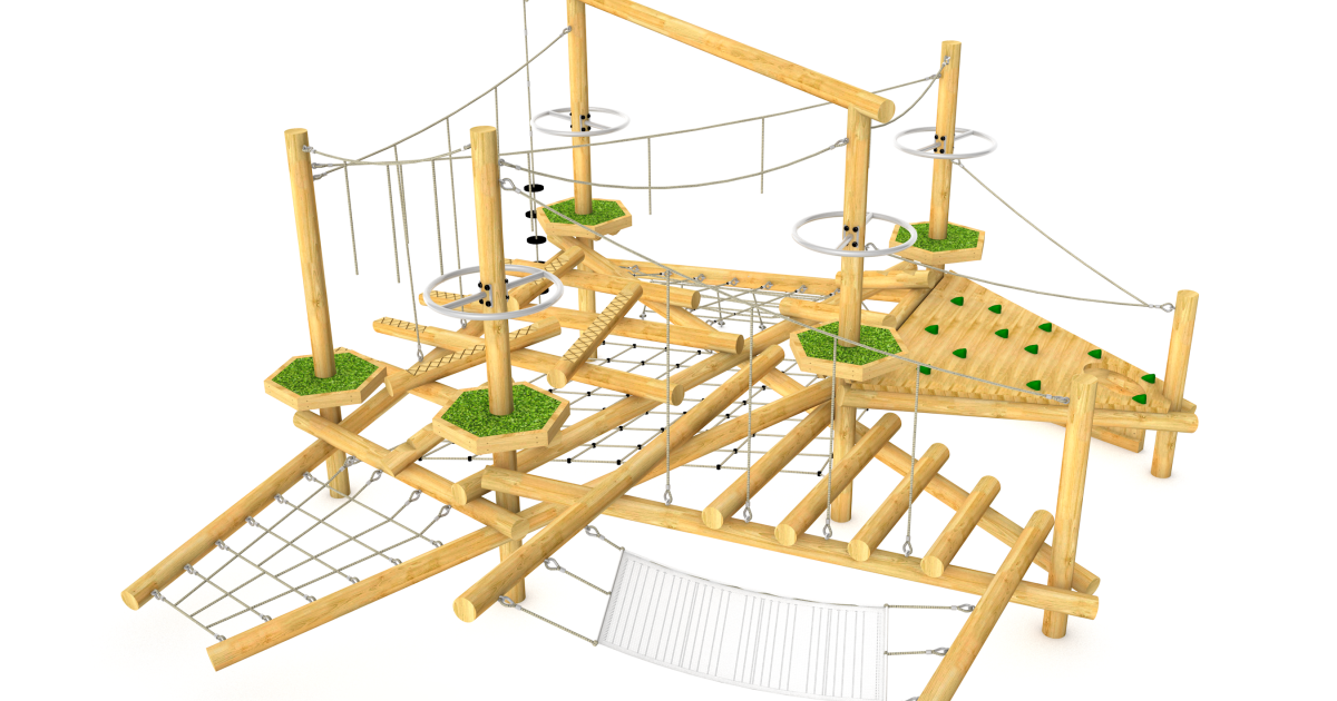 Hammock • Platforms (5) • Grip and Grasp Rails (4) • Drop Rope Crossing • Slalom Rope Traverse • Parallel Guide Rope • Vertical Climbing Wall • Climbing Ramp • Climbing Deck • Scramble Net • Cargo Net • Climbing Net • Suspended Net • Rope Ladder • Tarzan Challenge • Timber Crossings